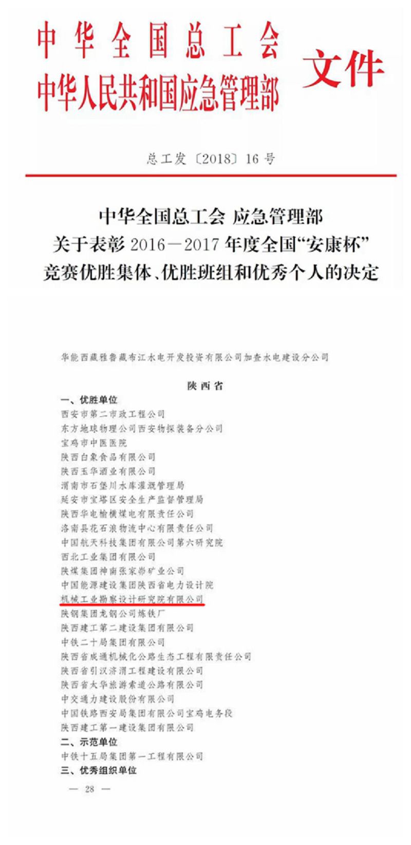 【概要描述】 6月12日,中華全國總工會、國家應急管理部在京召開全國安康杯競賽表彰暨經驗交流電視電話會議,我院作為陜西省23家單位之一獲評“全國‘安康杯’競賽優勝單位”榮譽稱號。