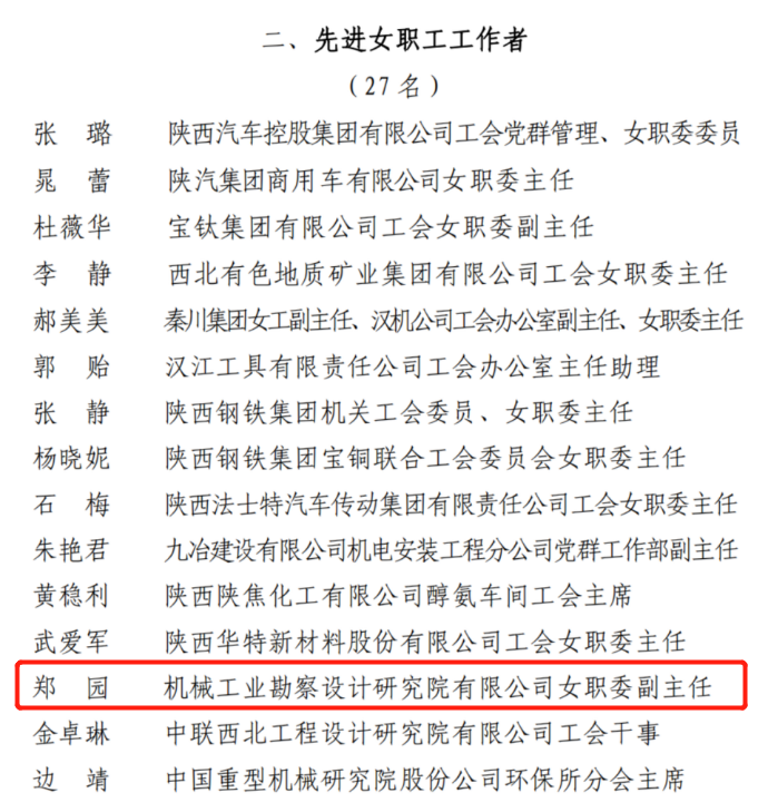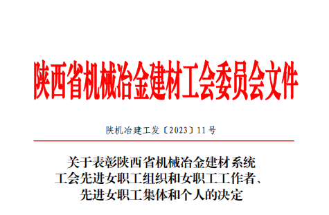 近日,陜西省機(jī)械冶金建材工會(huì)發(fā)布了《關(guān)于表彰陜西省機(jī)械冶金建材系統(tǒng)工會(huì)先進(jìn)女職工組織和女職工工作者、先進(jìn)女職工集體和個(gè)人的決定》(陜機(jī)冶建工發(fā)【2023】11號(hào)),我院兩名女職工受到表彰。