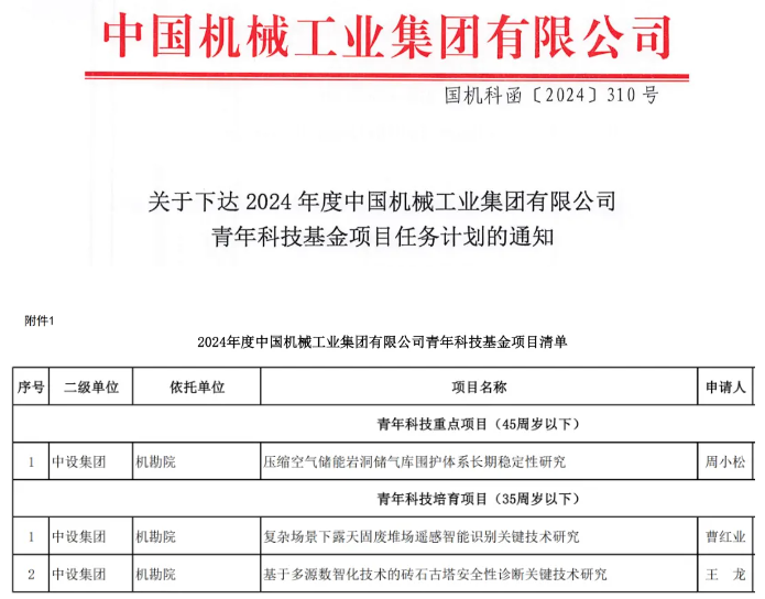 近日,國(guó)機(jī)集團(tuán)公布了2024年度中國(guó)機(jī)械工業(yè)集團(tuán)有限公司青年科技基金項(xiàng)目立項(xiàng)名單,機(jī)勘院榮獲1項(xiàng)青年科技重點(diǎn)項(xiàng)目、2項(xiàng)青年科技培育項(xiàng)目。