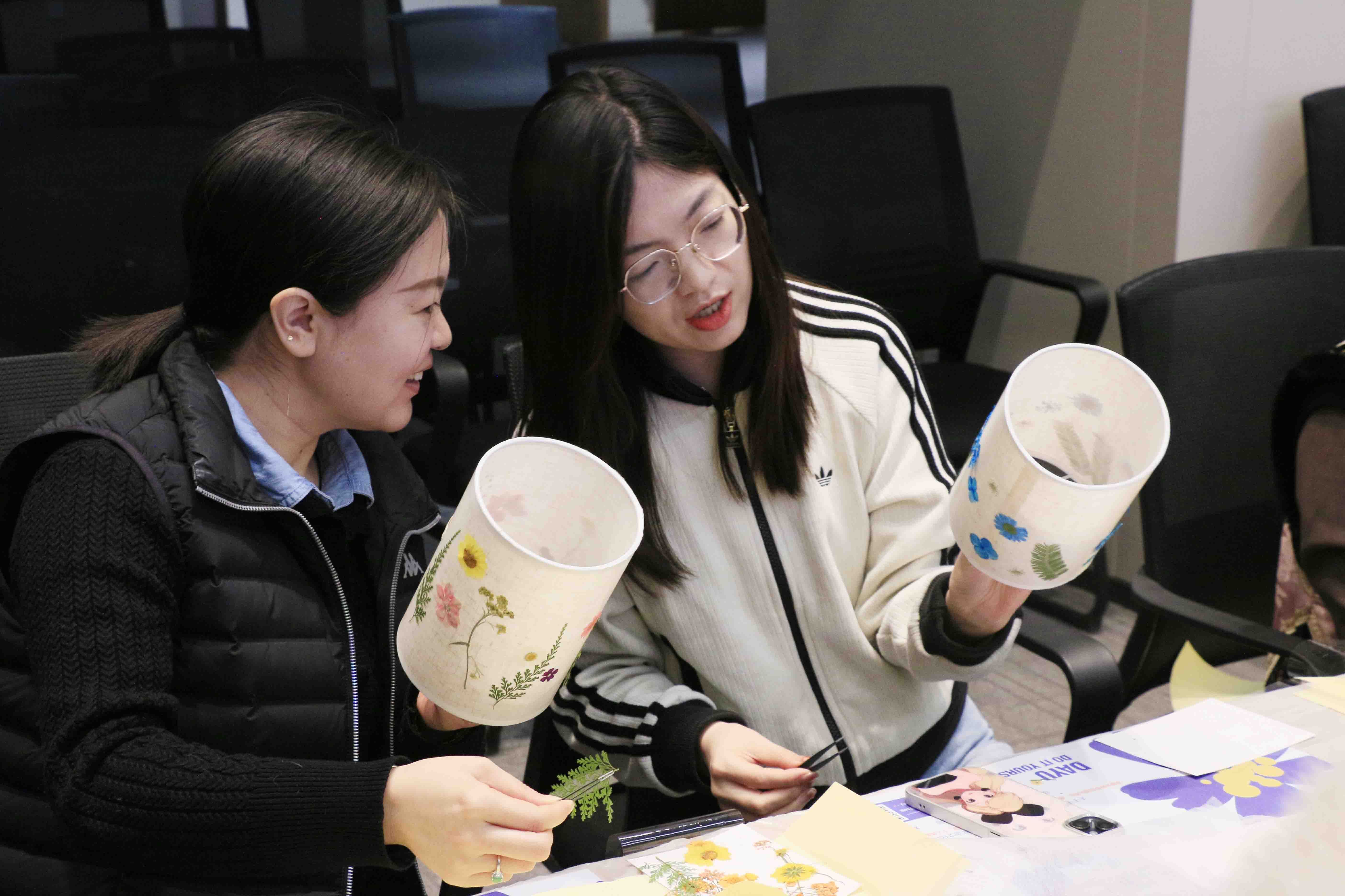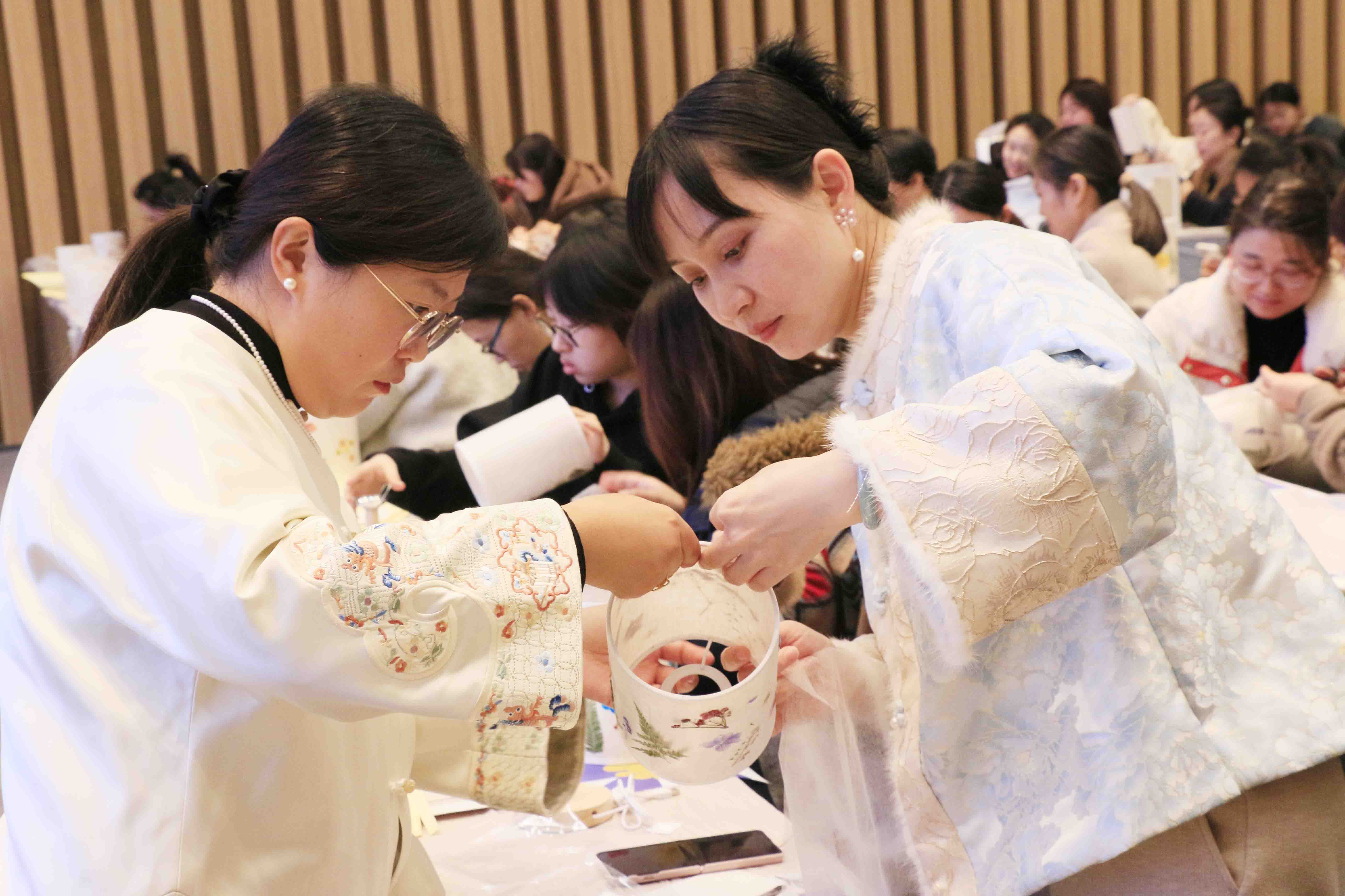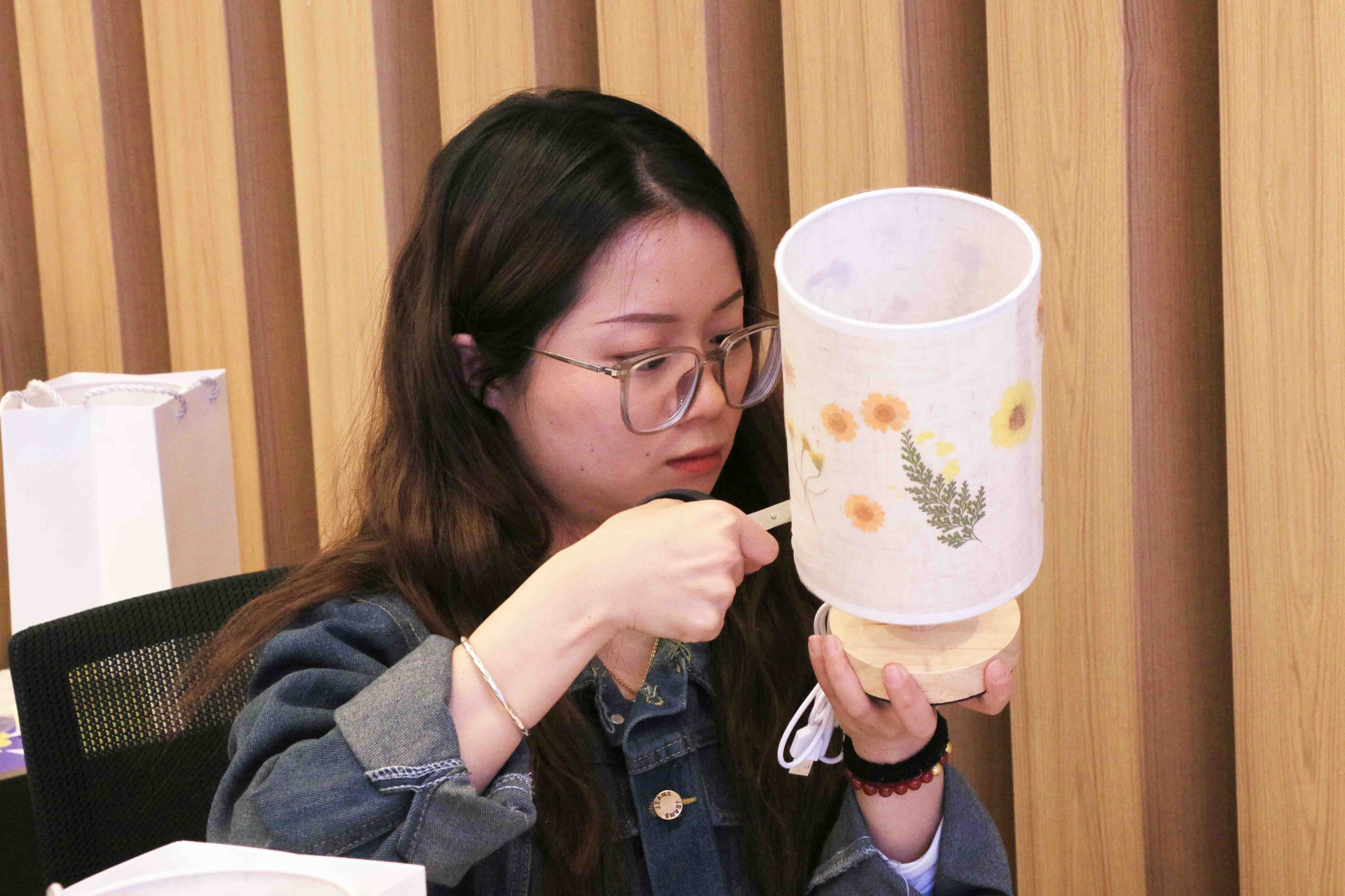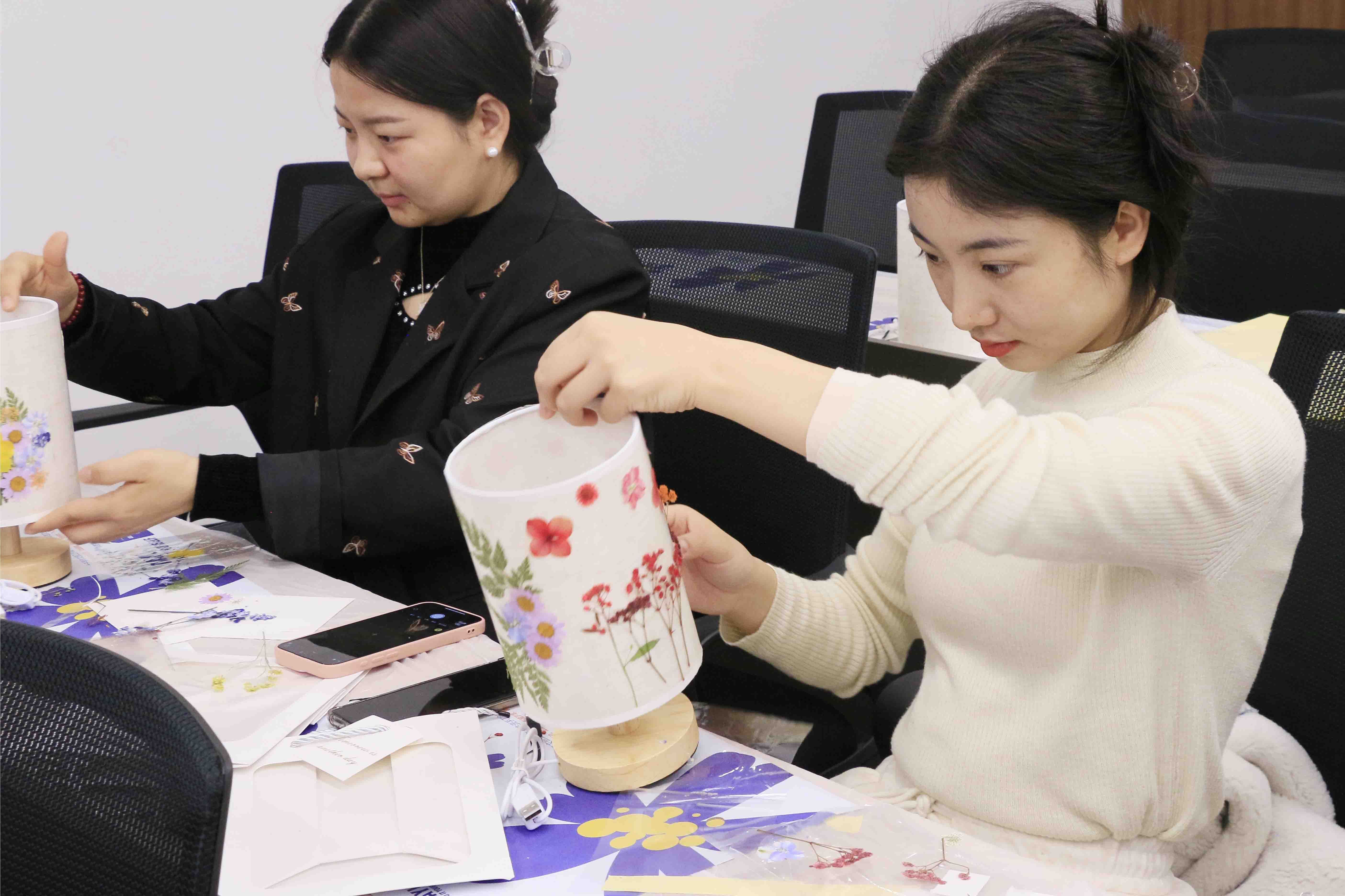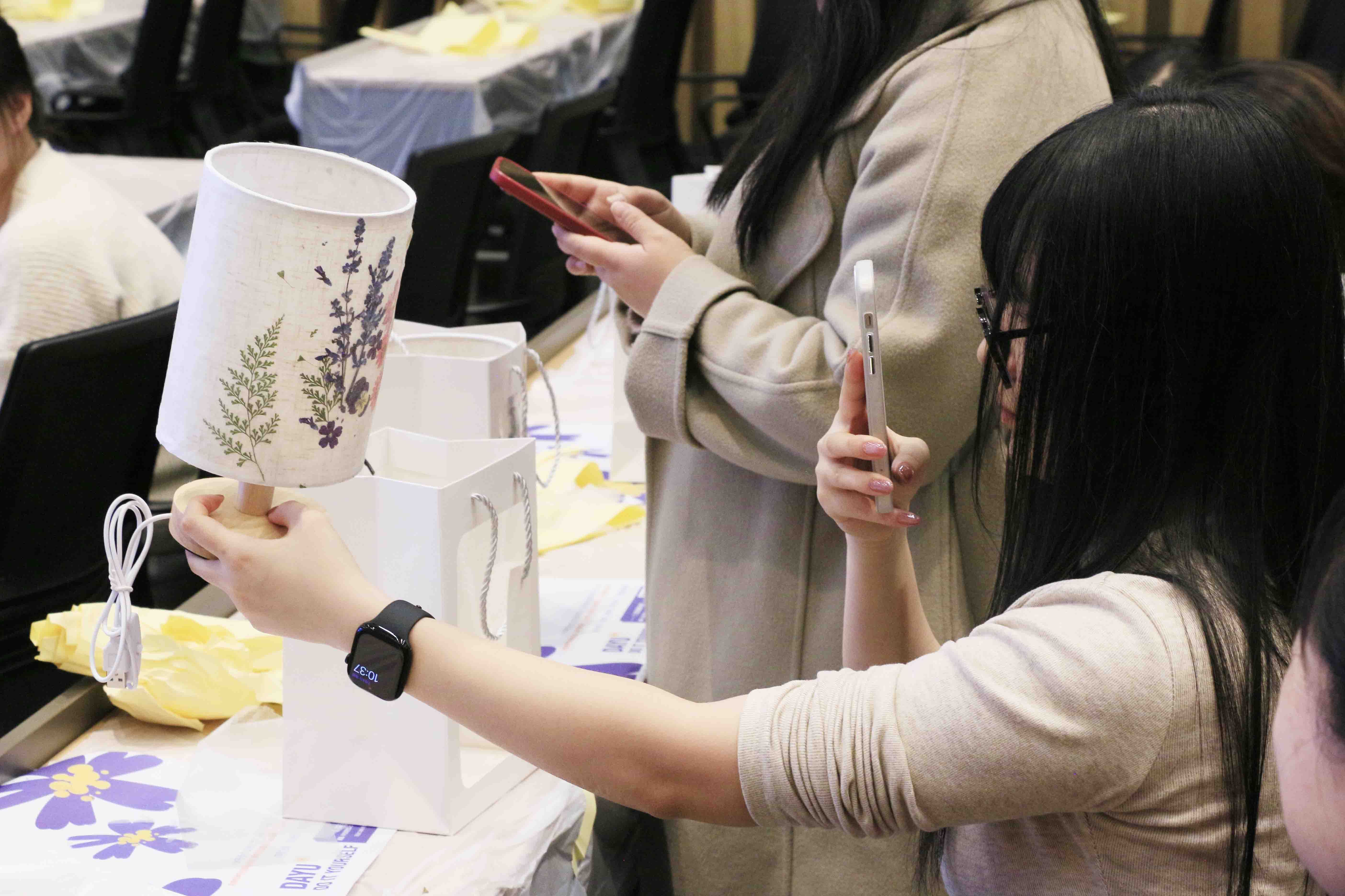 在沉浸式手作體驗環節,女職工們化身“非遺傳承人”,通過挑選花材、構思設計、標本固定、覆膜封裝等步驟,將干花綠植與臺燈巧妙結合。現場呈現出"春日繁花""星河爛漫"等各具特色的藝術作品,燈光亮起的瞬間,自然之美與人文匠心在光影中交織,展現出女職工們的細膩才情與創新活力。